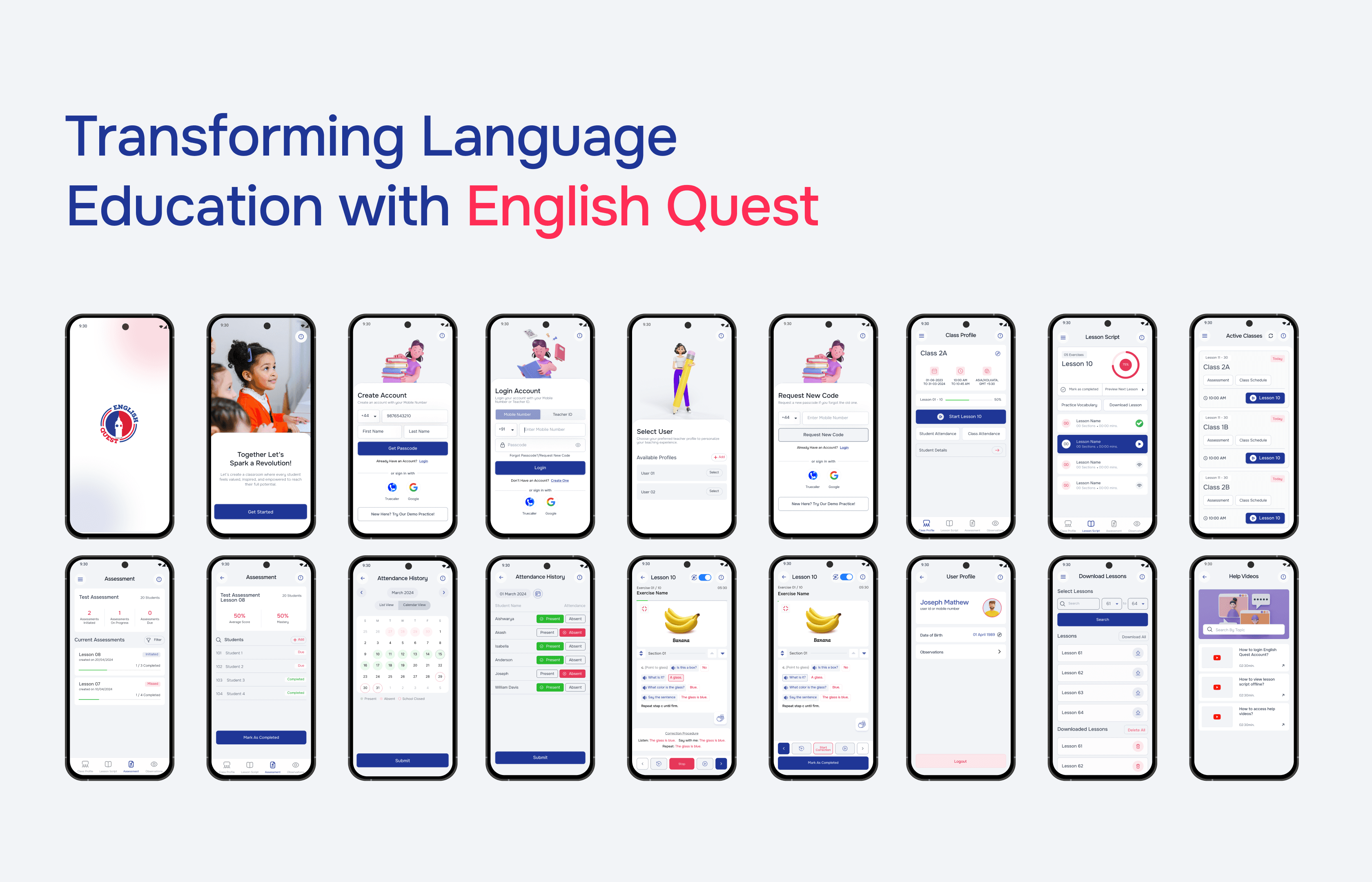 English Quest is an innovative education platform designed to enhance spoken English proficiency for students across the UK and India. The key challenge was to design an intuitive mobile experience that leverages VTT (Voice-to-Text) technology to provide real-time feedback, helping learners improve their pronunciation and confidence.
